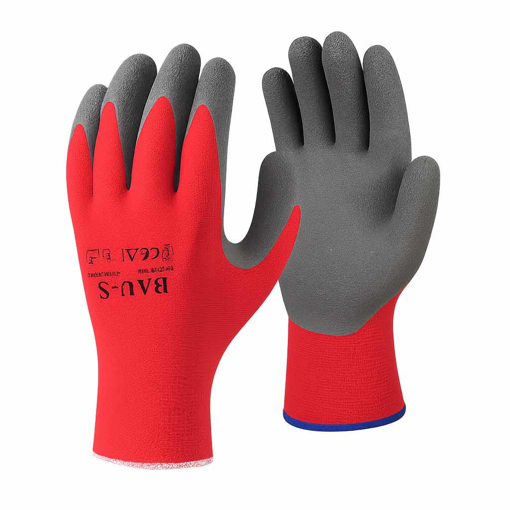 Radne rukavice sa lateks slojem Crvena tkanina, crni dlan i prsti Otporne na habanje i vlagu Dobar prijem i fleksibilnost Za grube i građevinske radove Višekratna upotreba