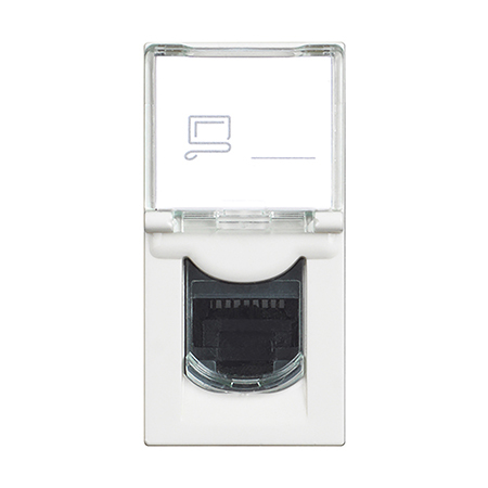 Utičnica je izrađena od termoplastike bez halogena, u beloj boji (RAL 9003). Montaža je ugradna (flush-mounted), a pričvršćenje je snap (engage) na nosač. Izlaz je prav (straight), bez zaštitnog poklopca od prašine. Poseduje prostor za etiketu/oznaku (label space), što olakšava obeležavanje linije ili prostorije.