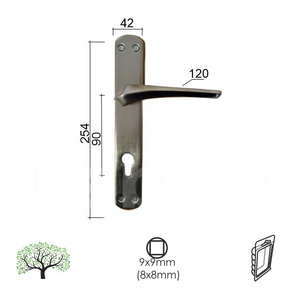 Dimenzije: razmak 90 mm, širina šilda 42 mm, visina 254 mm, debljina 10 mm, dužina ručice 120 mm.